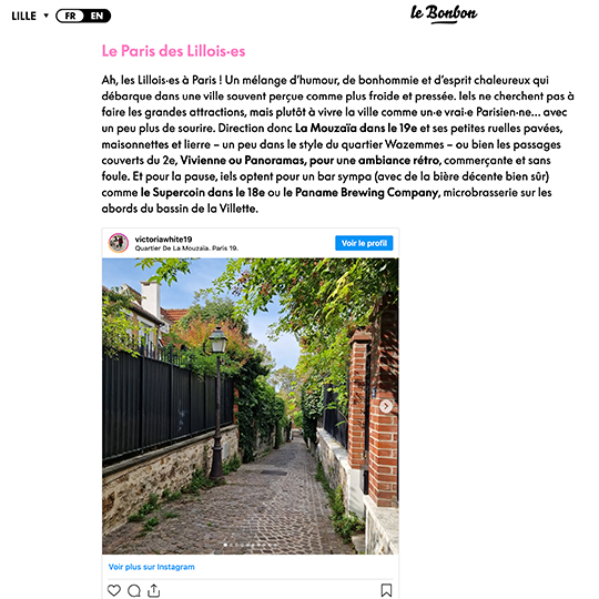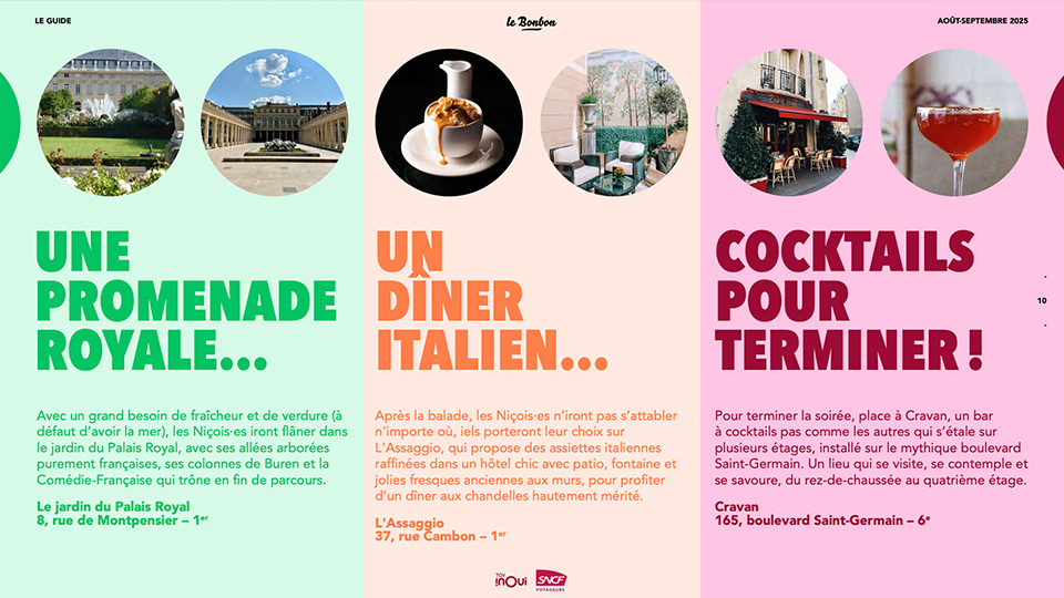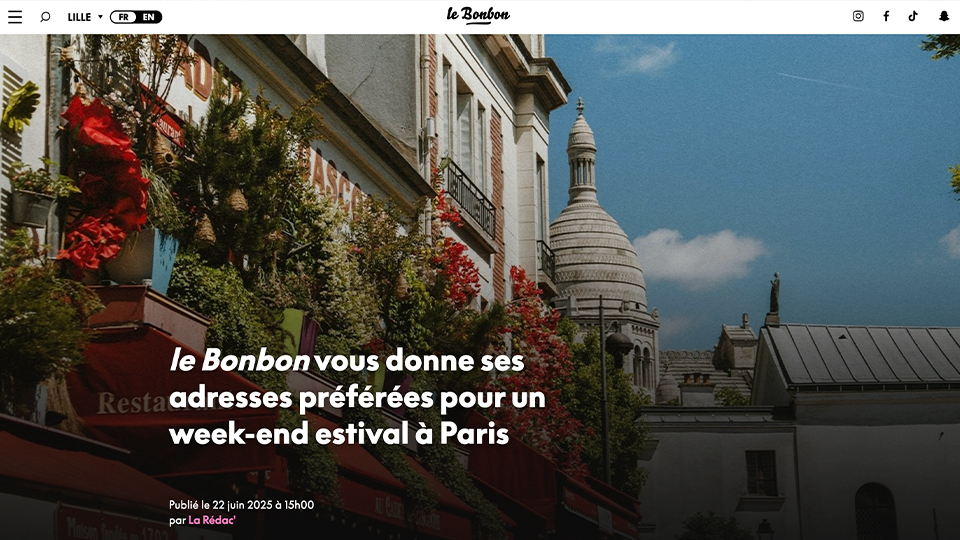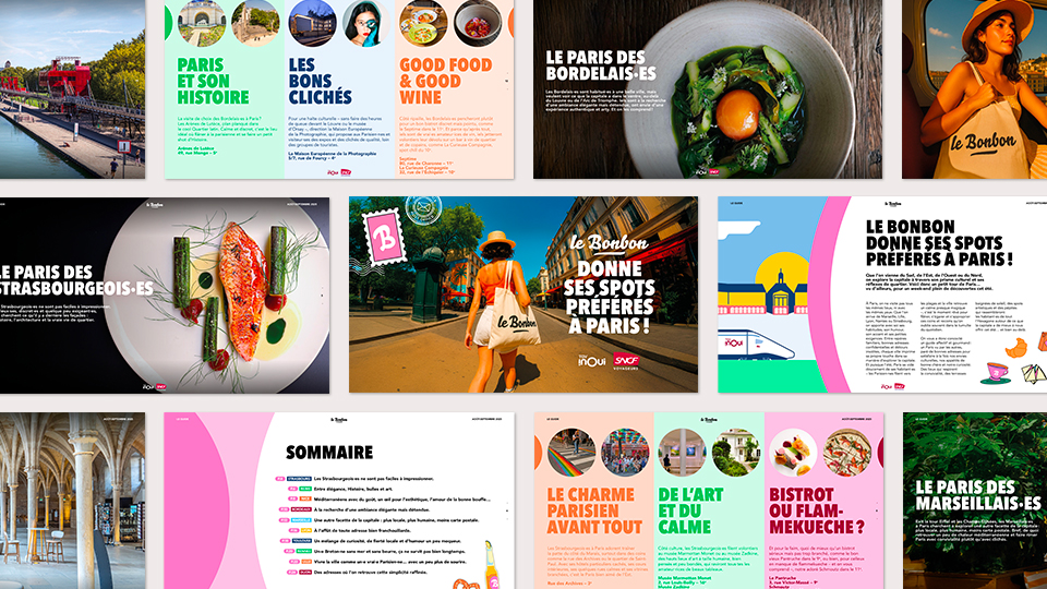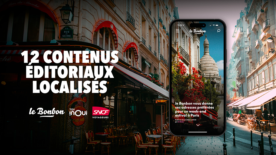 Et si arriver à Paris devenait déjà une expérience à part entière ? Pour mettre en avant le TGV INOUI ( rapide, confortable et en plein centre-ville) le Bonbon a imaginé un dispositif éditorial qui donne envie de sauter dans le train direction la capitale. - 4 vidéos au départ de Lyon, Bordeaux, Lille et Marseille : nos journalistes locaux embarquent à bord du TGV INOUI et partagent leur Paris à eux. Balades secrètes, cafés planqués, bons plans bien sentis… chaque trajet devient une mini-aventure. - 12 articles pour 12 villes où Le Bonbon est présent : chacun sert de passerelle vers Paris, avec des tips et coups de cœur locaux pour préparer son escapade. - Un city guide complet rassemble tous ces contenus est à retrouver sur le site de TGV INOUI, pour prolonger l’expérience avant même de monter dans le train. Un projet qui transforme le voyage en aventure et fait de Paris une destination toujours plus vivante, humaine… et surprenante.